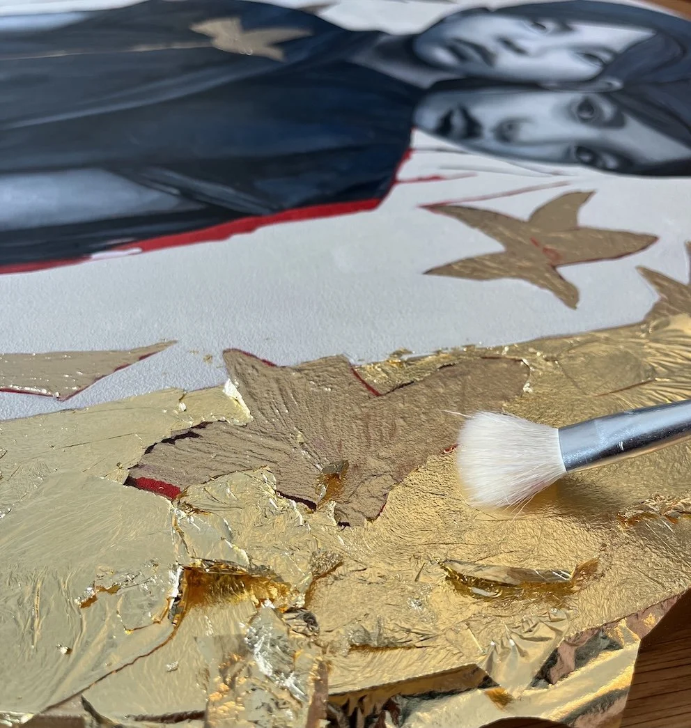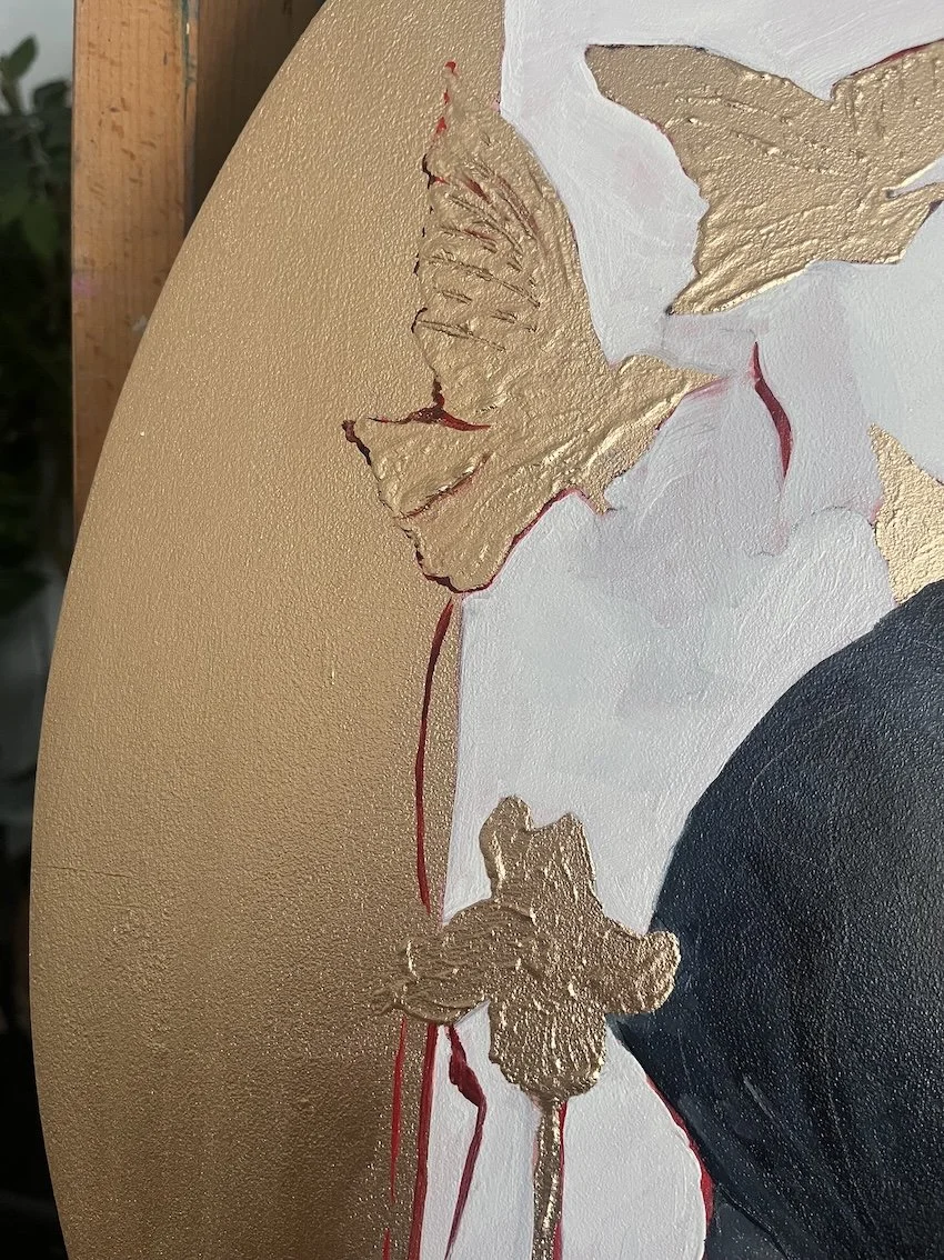 In the shelter of her love Technique: Oil paint, bronze paint and metal leaf on wood panel Size 60 cm ∅Price 575,00 euro --- All artworks